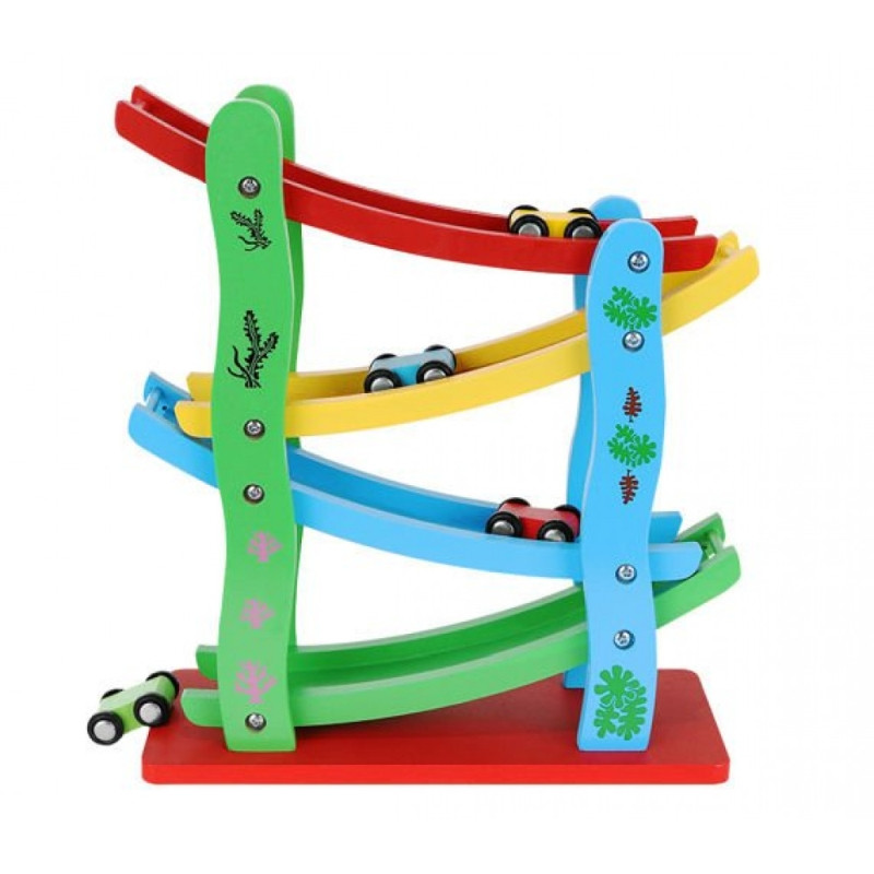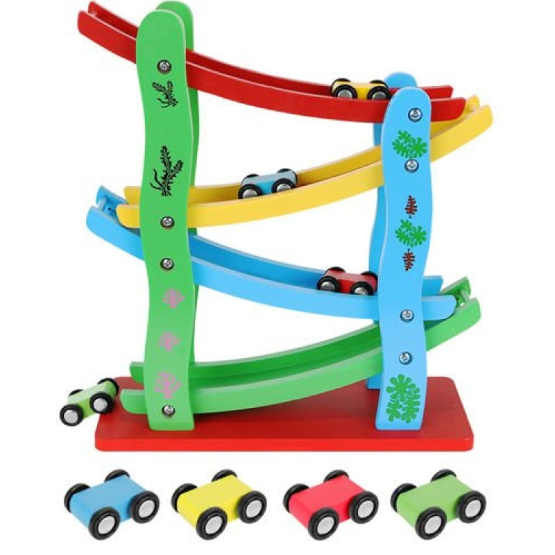 šmykľavka so 4 autíčkami (zelené, modré, červené a žlté). Celé je to