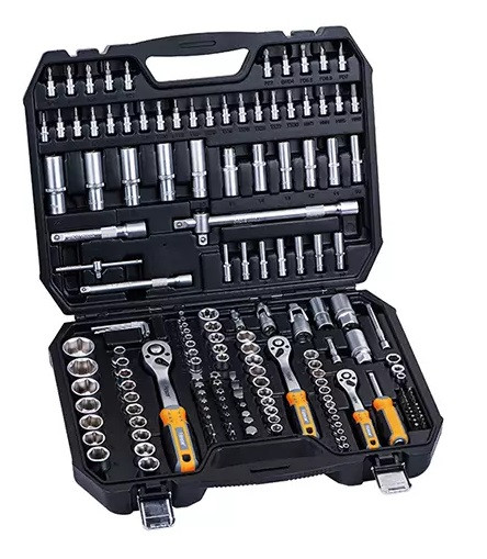 Skvele vybavená sada nástavcov a hlavíc veľkosti 1/4" - 1/2" - 3/8" umiestnených v praktickom plastovom kufríku. Skladá sa zo 171 dielov vyrobených z vysoko kvalitnej chróm-vanádiovej ocele (50BV30). Sada obsahuje komplexný rad šesťhranných hlavíc, ktoré sú dodávané v dvoch verziách: krátke a dlhé pre rôzne aplikácie. V sade sú tiež hlavice profilu E (vnútorný torx) a hlavice s bitmi TORX, Imbus, ploché a krížové nástavce.
