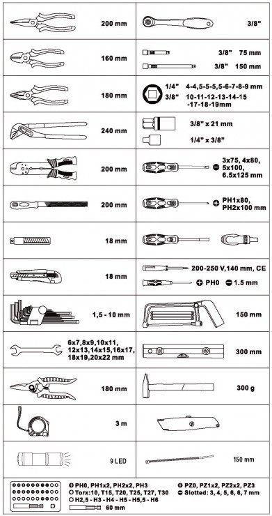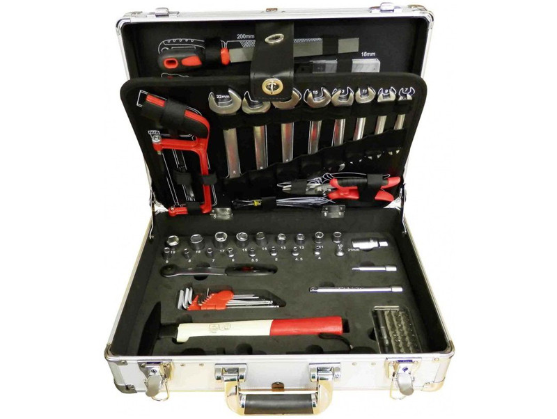 Materiál: ocel chrom vanadium + plastFarba: chrómová + červenáHmotnosť: 6,00 kgObsah balenia: sada náradia 109 dielov, hliníkový kufor