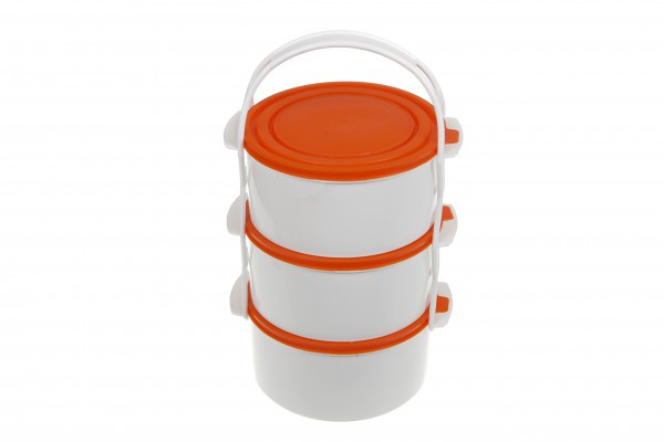 3-dielny plastový obedár s praktickým držiakom a uzatváracími viečkami.