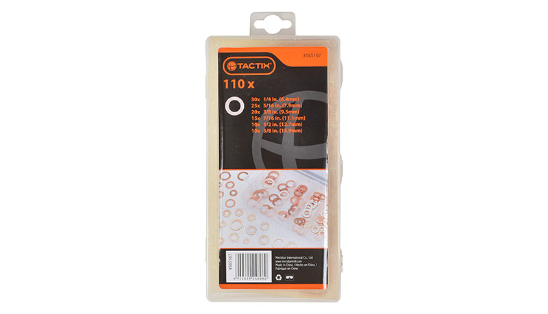 Sada 110 ks medených podložiek od značky Tactix. V balení nájdete podložky od 6,4 do 15,9 mm. Podložky sú odolné voči korózii.