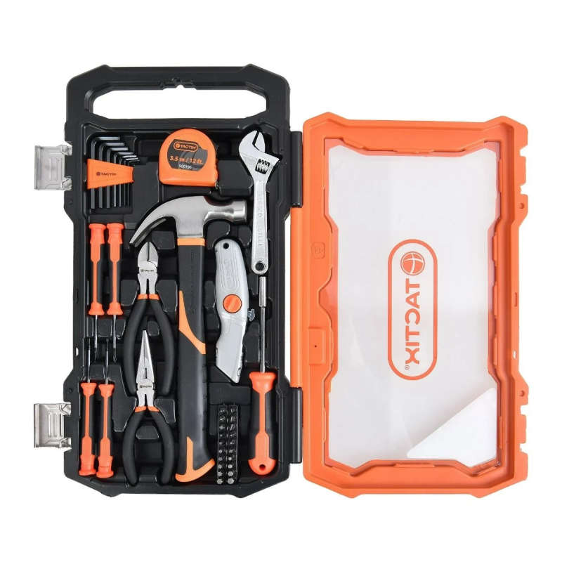 Sada ručného náradia. Plastový kufrík udržuje náradie v bezpečí, čistote a organizovanom pre ľahké skladovanie a prepravu.