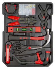| 304 x drobné príslušenstvo (klinčeky, hmoždinky, skrutky, pripínačky) | 1 x skrutkovač na bity s rukoväťou | 2 x račňa 1/2", 1/4" |
