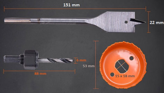 - vykružovacia korunka priemer 53 mm, vŕtanie do hĺbky 25 mm