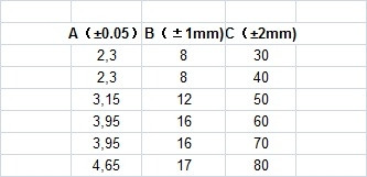 (Odchýlky rozmerov: A: +/- 0.05 mm; B: +/- 1 mm; C: +/- 2 mm)
