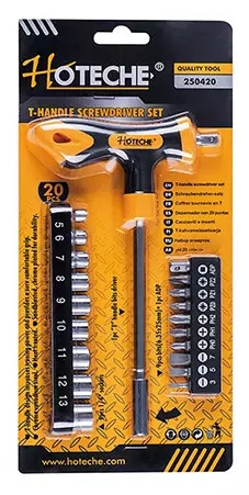- Skrutkovač s T rukoväťou a príslušenstvom 1/4” 20ks Cr-V HOTECHE HT250420