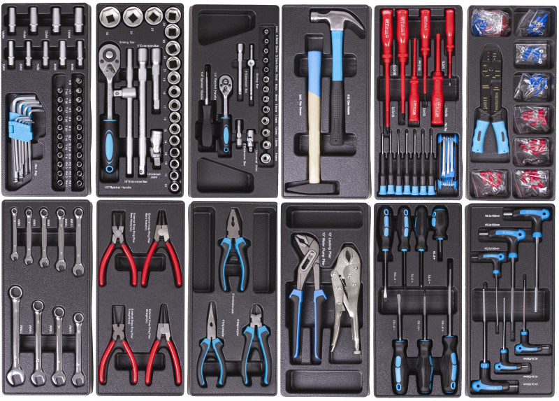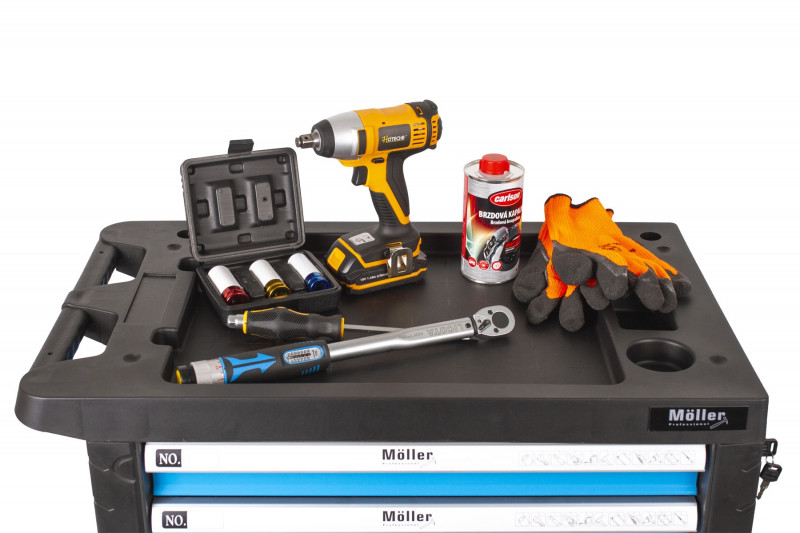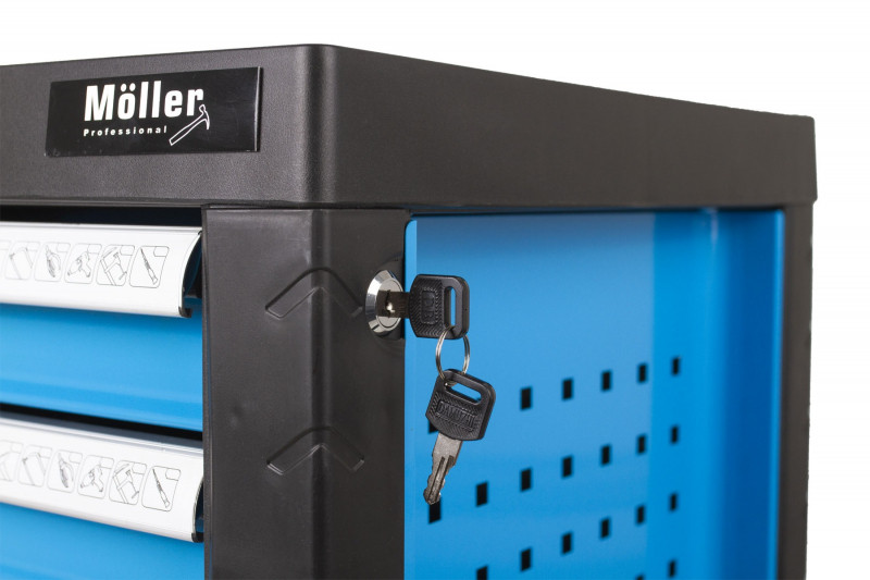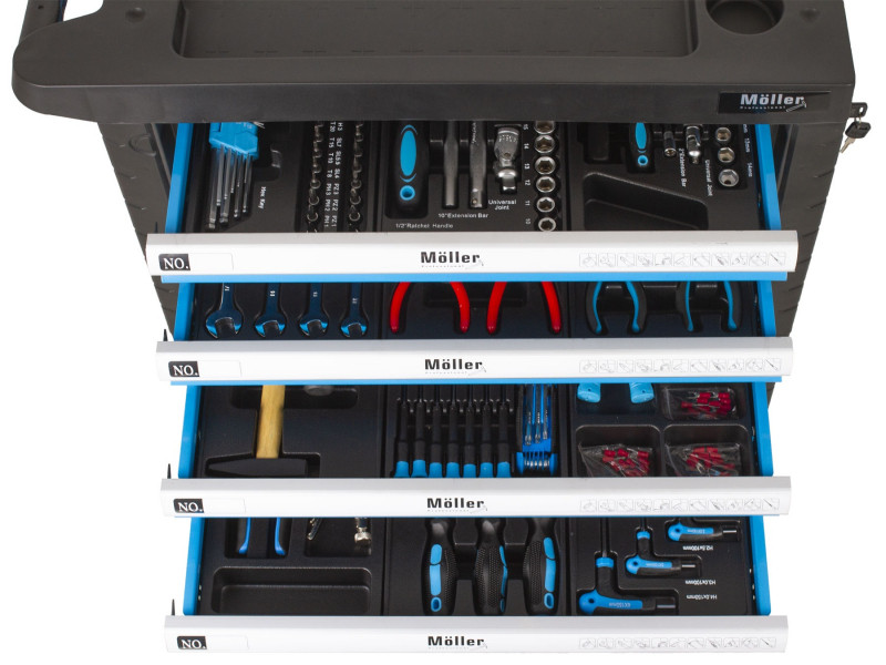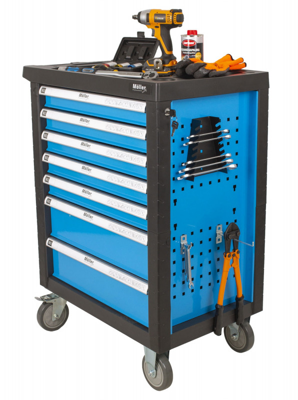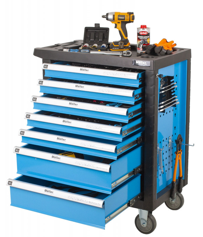 - 7 zásuviek s guličkovými ložiskami - 4 zásuvky sú vybavené bežne používaným náradím (gola sady, kliešte, rôzne druhy skrutkovačov, kladivá, kľúče a pod.), 3 zásuvky si môžete dovybaviť náradím podľa svojich požiadaviek, horná doska vozíka môže slúžiť ako pracovný stôl