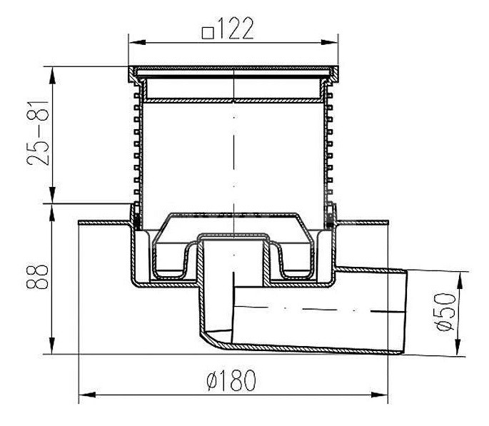 - Vpusť podlahová bočná D50 s plavákom (límec, nerezová mriežka SUN) (MCH-425 X L)