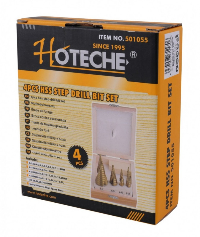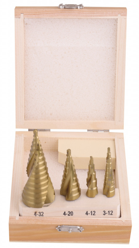 Vrtáky stupňovité 4-dielna sada (3-12 mm, 4-12 mm, 4-20 mm, 4-32 mm HOTECHE HT501055